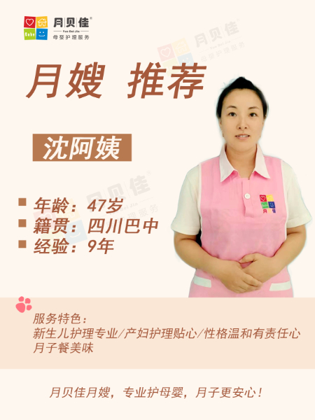 月贝佳优秀月嫂推荐,沈阿姨|9 年母婴护理经验|四川巴中